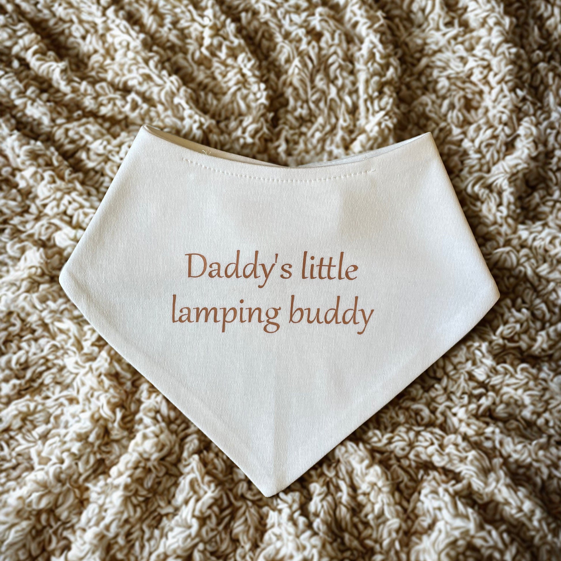 Wrap your little one in comfort and cuteness with our “Daddy’s Little Lamping Buddy” Baby Bandana Bib. Made from ultra-soft, absorbent cotton, this white-coloured bib is perfect for keeping baby dry and stylish during drooly days and messy moments. The charming phrase is printed in a warm, rustic font.