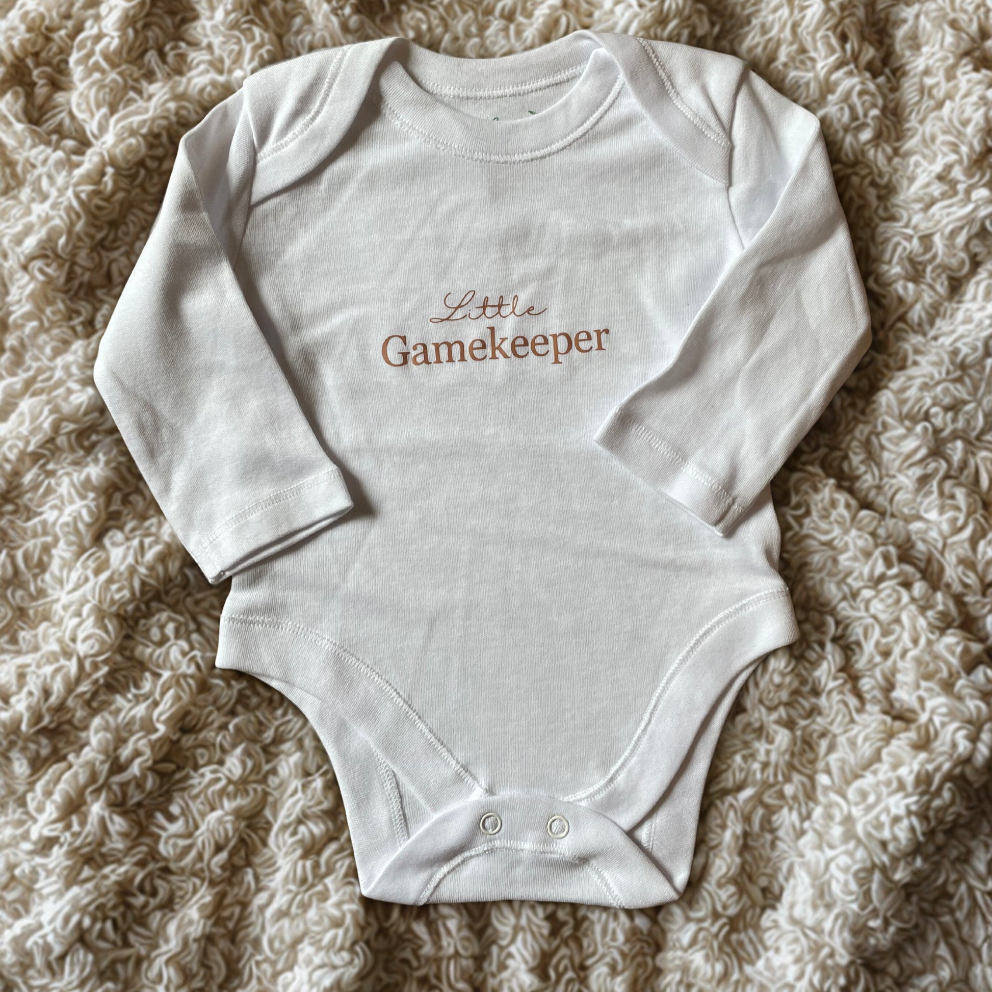 Wrap your little one in comfort and charm with this adorable bodysuit, perfect for the tiniest member of the family. Made from soft, breathable cotton, this long-sleeve white bodysuit features snap closures for easy changing and a playful printed message: “Little gamekeeper'