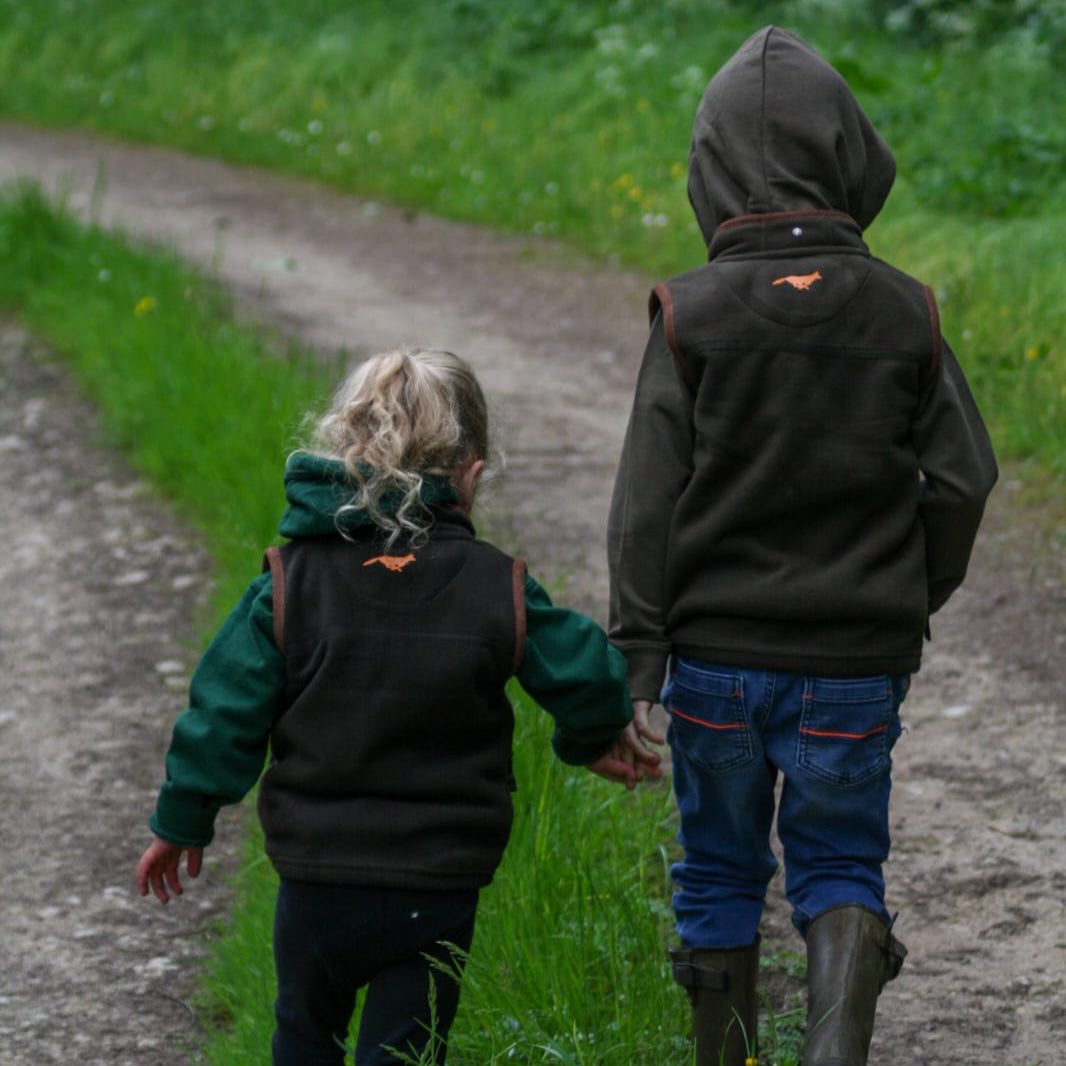 Keep your little adventurer warm and stylish with this charming kids’ fleece gilet. Designed for comfort and practicality, this dark olive green gilet features soft brown trim around the collar, zipper, and hem for a classic countryside look with a cute fox printed on the back, making it a perfect choice for young outdoor enthusiasts.