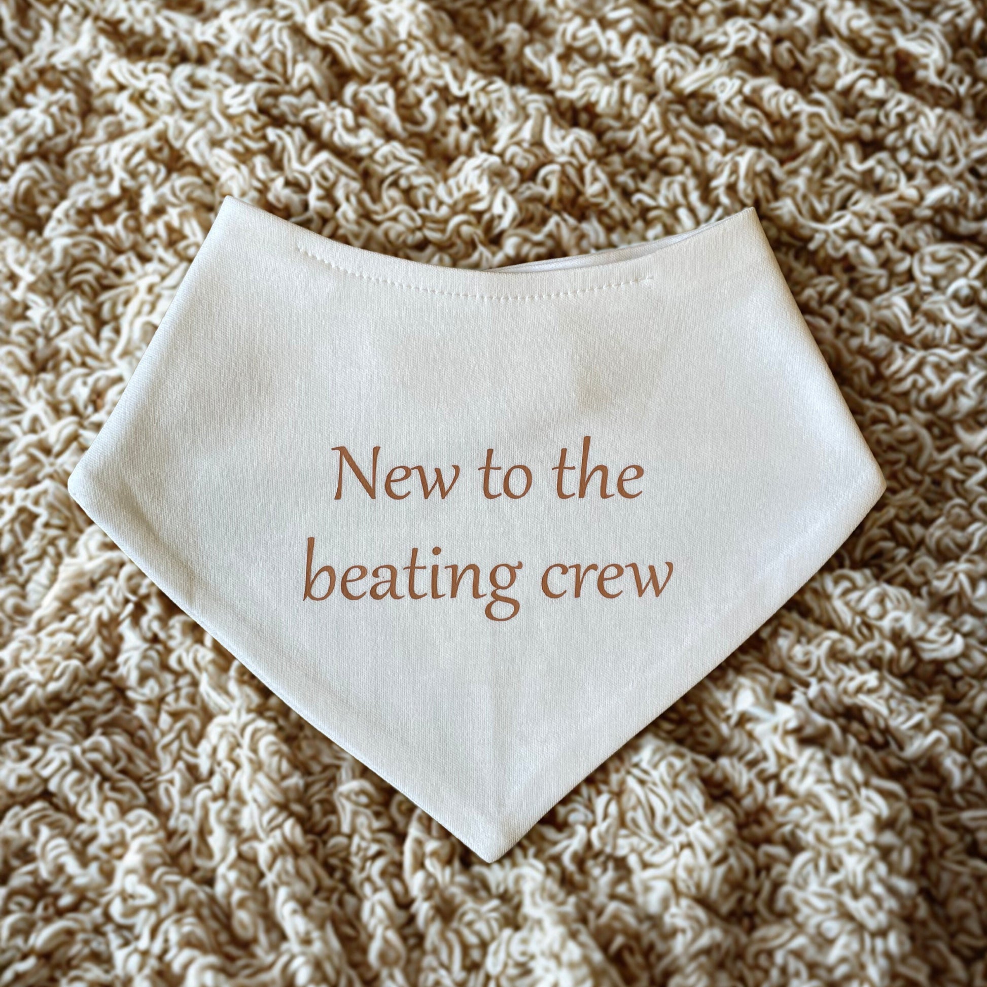 Wrap your little one in comfort and cuteness with our “New to the beating crew” Baby Bandana Bib. Made from ultra-soft, absorbent cotton, this white-coloured bib is perfect for keeping baby dry and stylish during drooly days and messy moments. The charming phrase is printed in a warm, rustic font.
