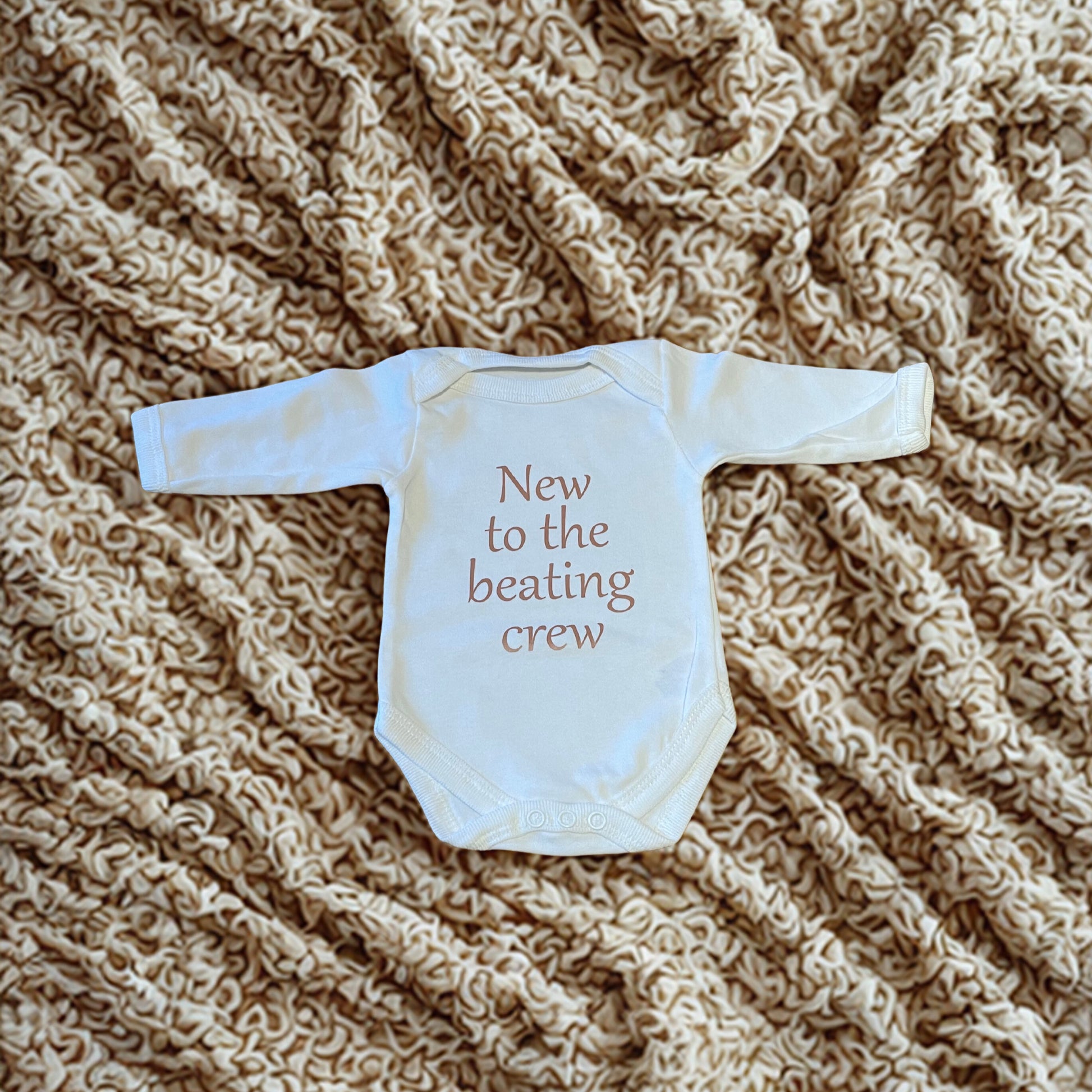Wrap your little one in comfort and charm with this adorable newborn bodysuit, perfect for the tiniest member of the family. Made from soft, breathable cotton, this long-sleeve white bodysuit features snap closures for easy changing and a playful printed message: “New to the beating crew.”